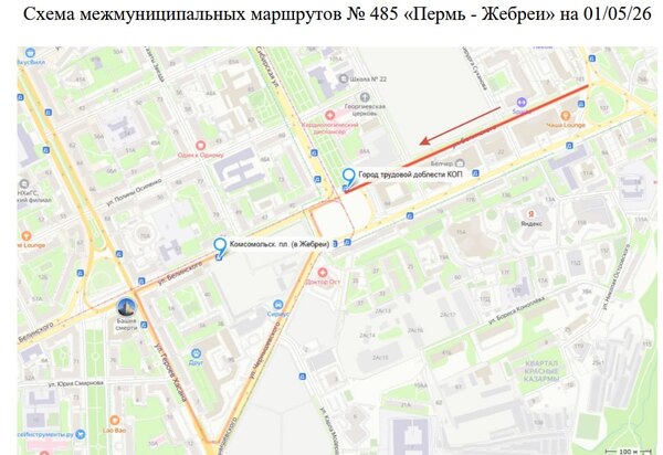 Маршруты № 205, №522, № 543: от остановки «Лицей 32» следуют по ул. Карла Маркса до проспекта Маяковского с пропуском остановок «ул. Пушкина», «Поликлиника», «ул. Карла Маркса» (в направлении из г. Краснокамск). Аналогично в обратном направлении.