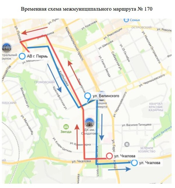 от остановки «Печатная фабрика Гознак» в сторону автовокзала г. Перми проследуют по ул. Малкова, ул. Фридриха Энгельса, ул. Локомотивная, ул. Екатерининская, ул. Луначарского, ул. Борчанинова, ул. Пушкина. В обратном направлении по ул. Пушкина, ул. Крисанова, ул. Екатерининская, ул. Ленина, ул. Локомотивная, ул. Фридриха Энгельса, ул. Малкова.